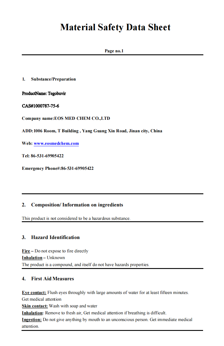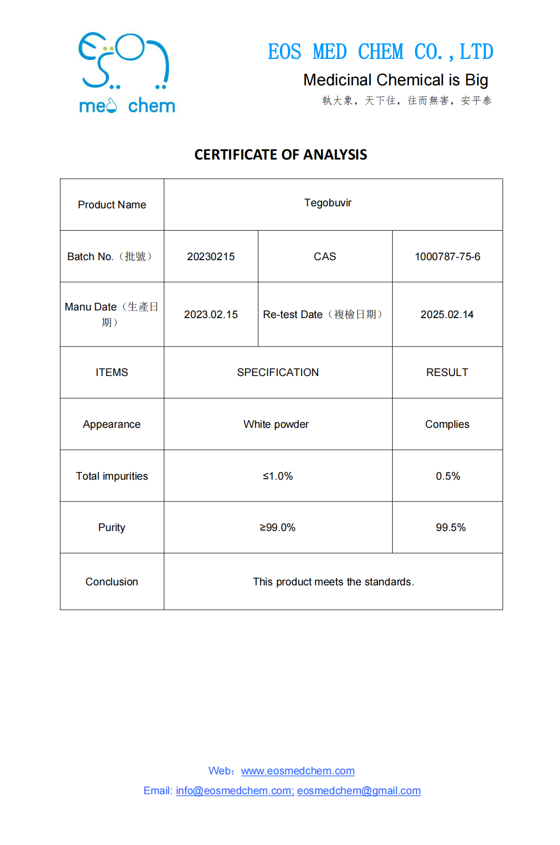 Tegobuvir, CAS 1000787-75-6, Stock 486g, Assay 99.5%, White powder, Water 0.19%, Single Impurity 0.5%.