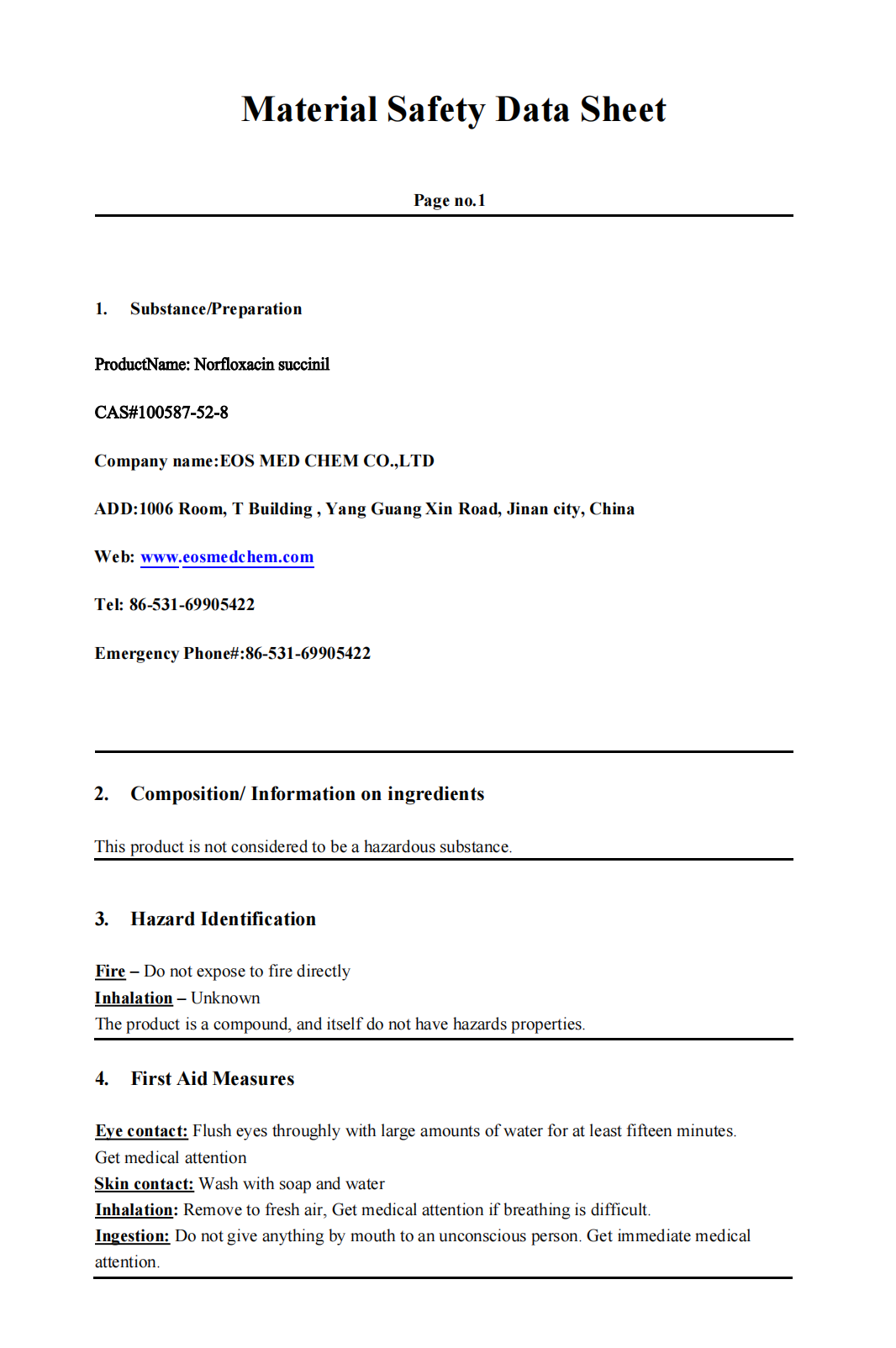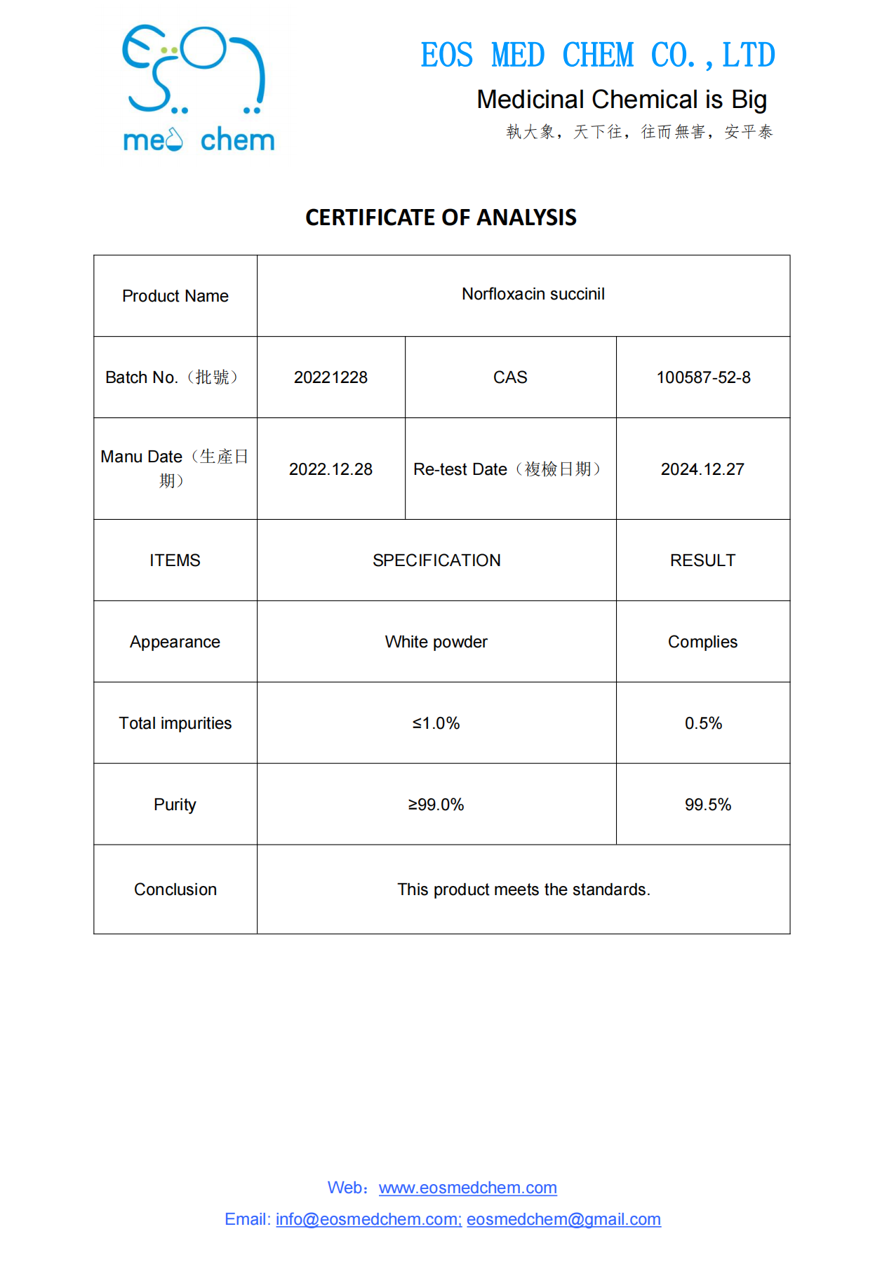 Norfloxacin succinil, CAS 100587-52-8, Stock 458g, Assay 99.5%, White powder, Water 0.32%, Single Impurity 0.5%.