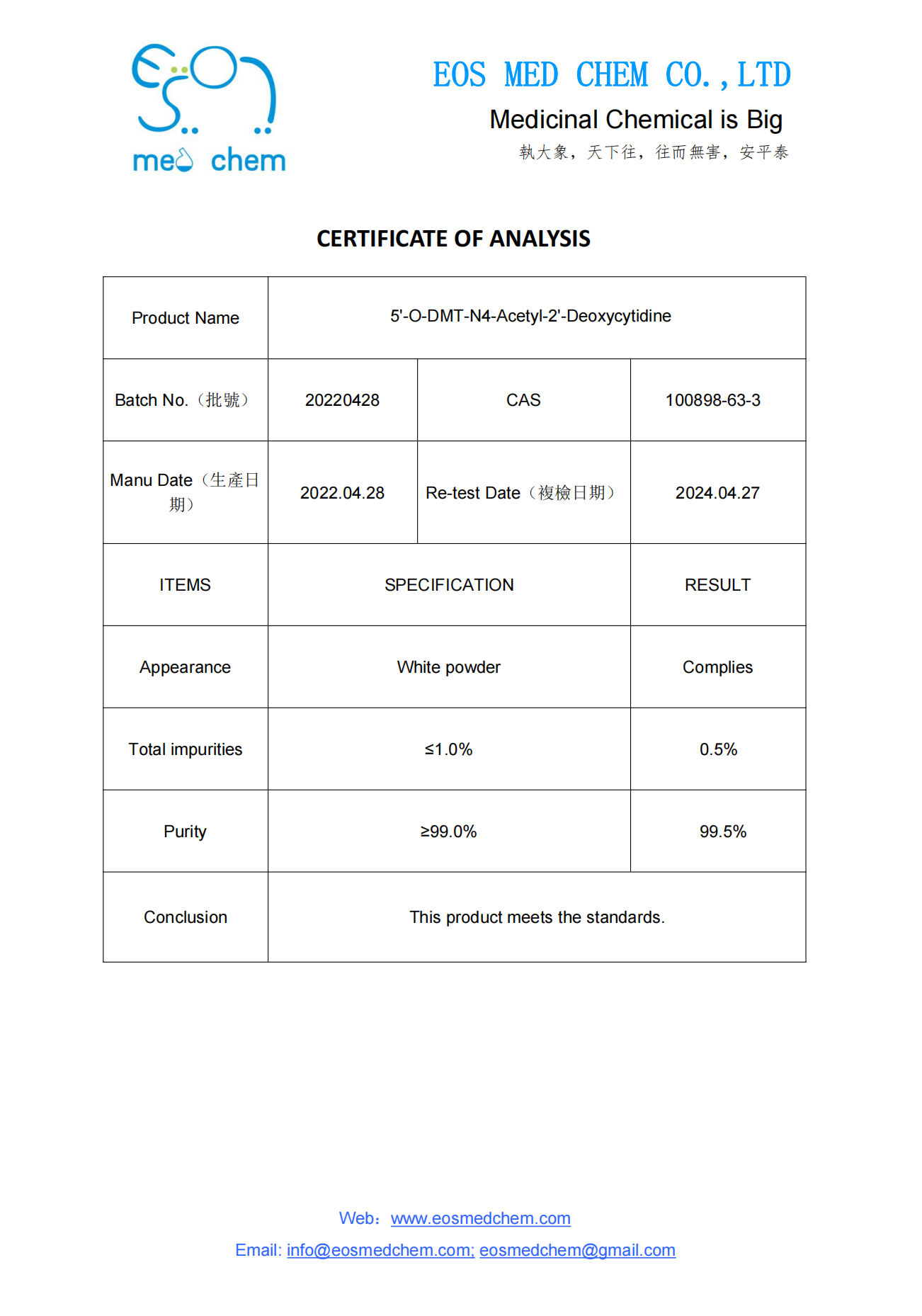 5'-O-DMT-N4-Acetyl-2'-Deoxycytidine, CAS 100898-63-3, Stock 390g, Assay 99.5%, White powder, Water 0.45%, Single Impurity 0.5%.