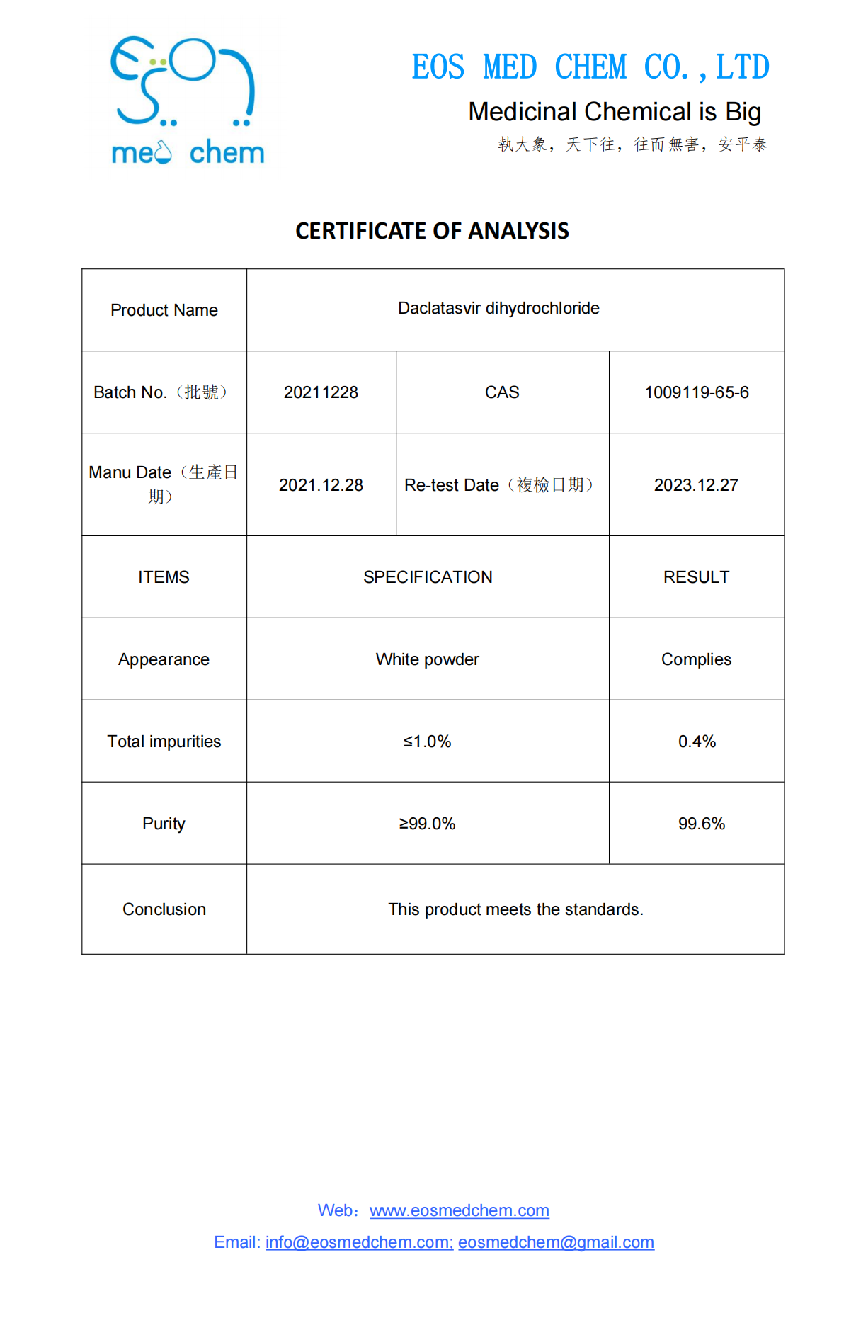 Daclatasvir dihydrochloride, CAS 1009119-65-6, Stock 586g, Assay 99.6%, White powder, Water 0.18%, Single Impurity 0.4%.