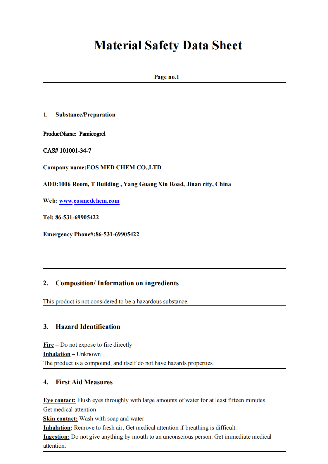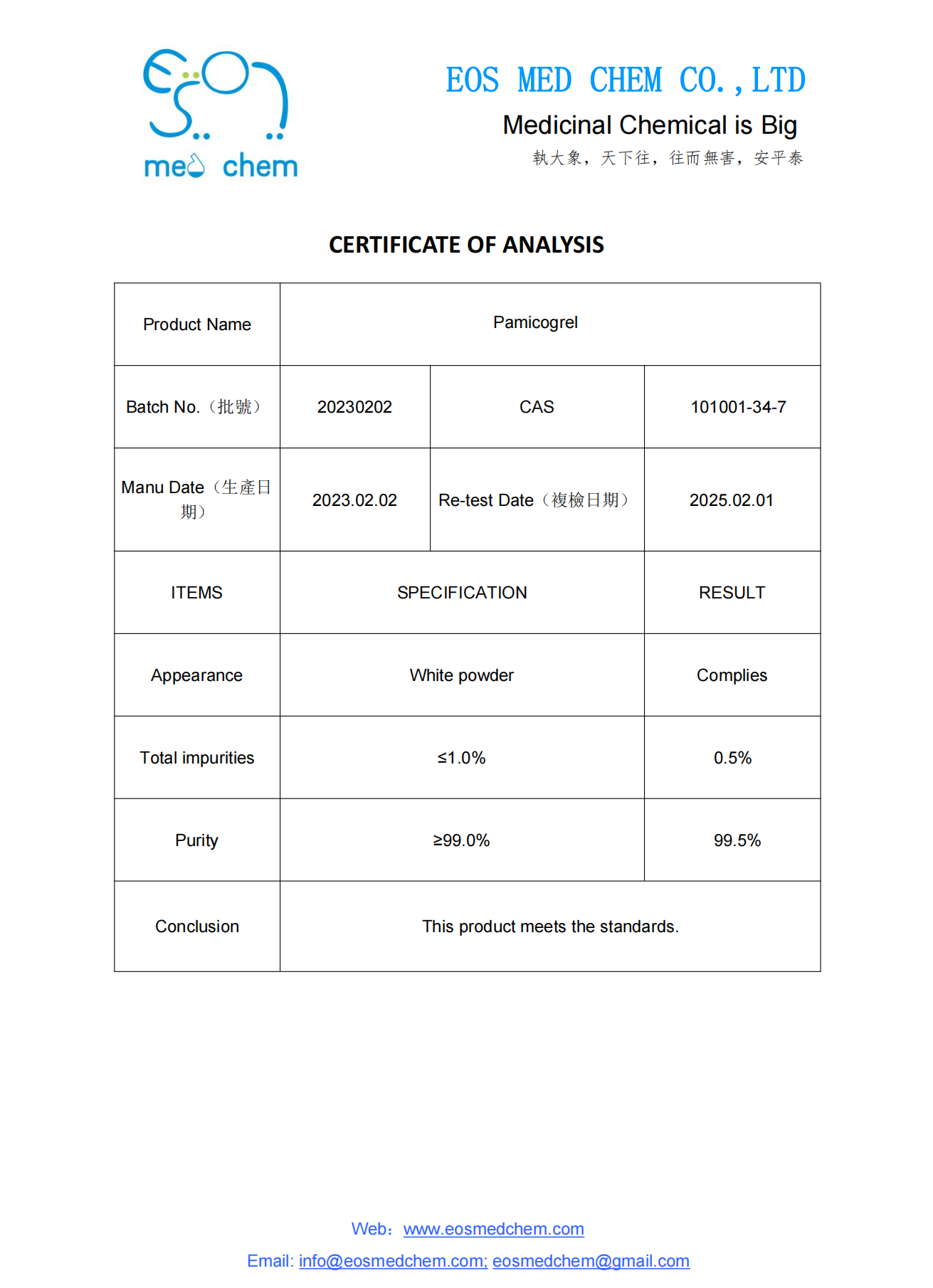 Pamicogrel, CAS 101001-34-7, Stock 270g, Assay 99.5%, White powder, Water 0.48%, Single Impurity 0.5%.