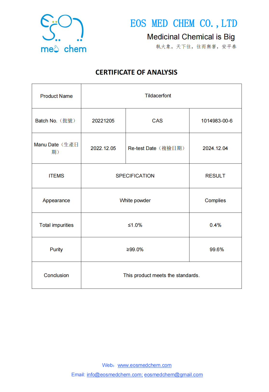 Tildacerfont, CAS 1014983-00-6, Stock 200g, Assay 99.6%, White powder, Water 0.31%, Single Impurity 0.4%.