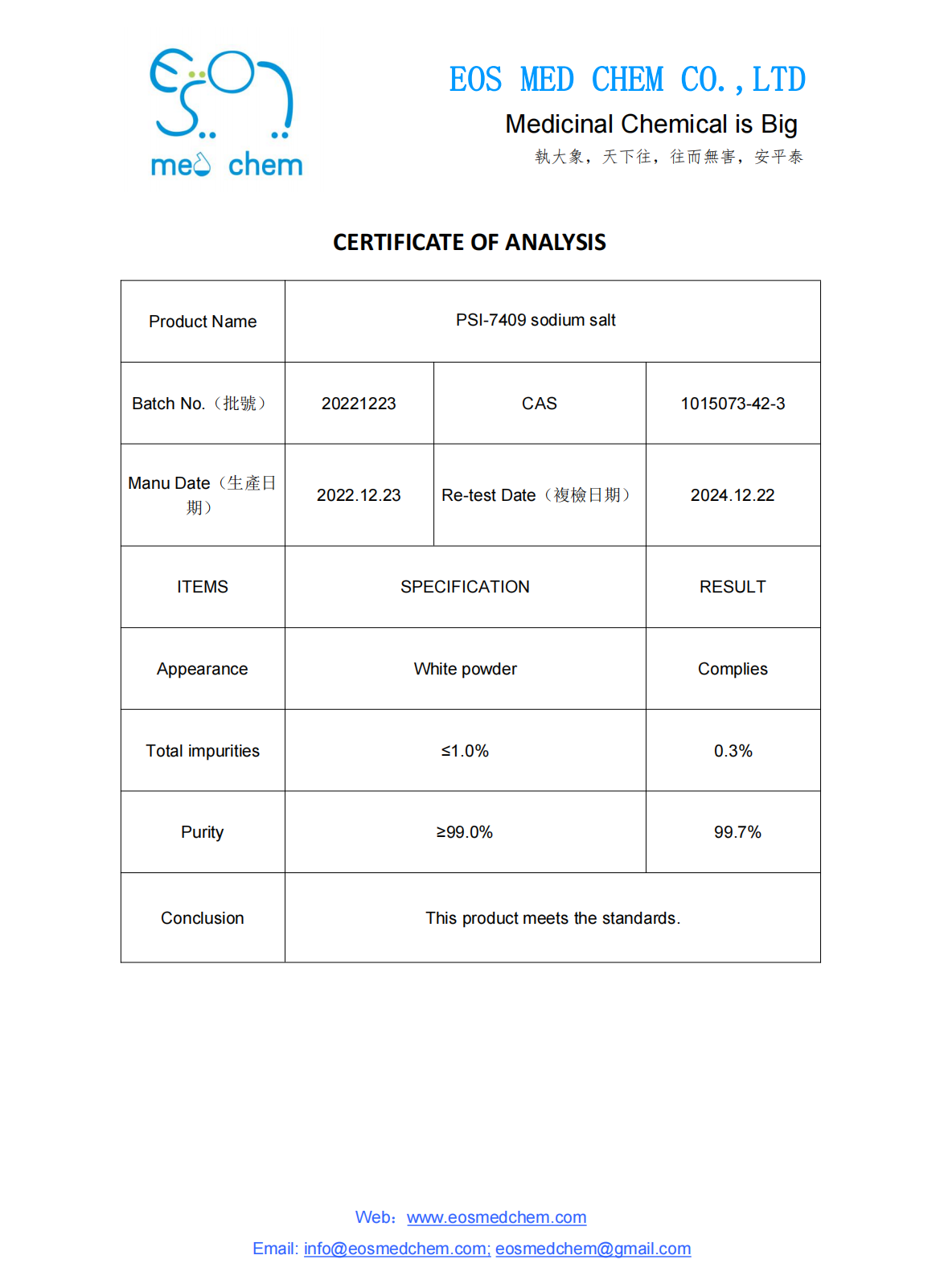 PSI-7409 sodium salt, CAS 1015073-42-3, Stock 250g, Assay 99.7%, White powder, Water 0.27%, Single Impurity 0.3%.