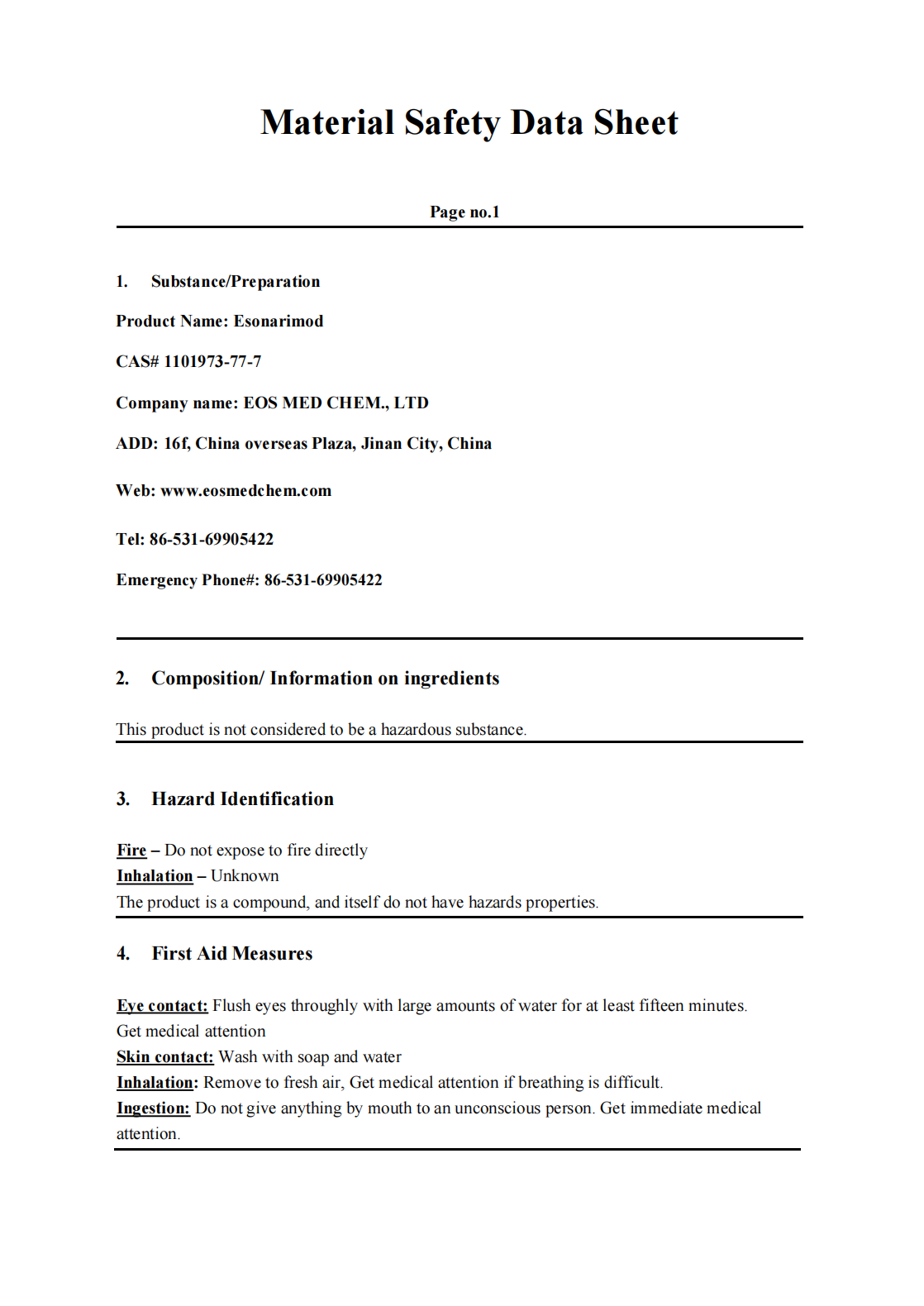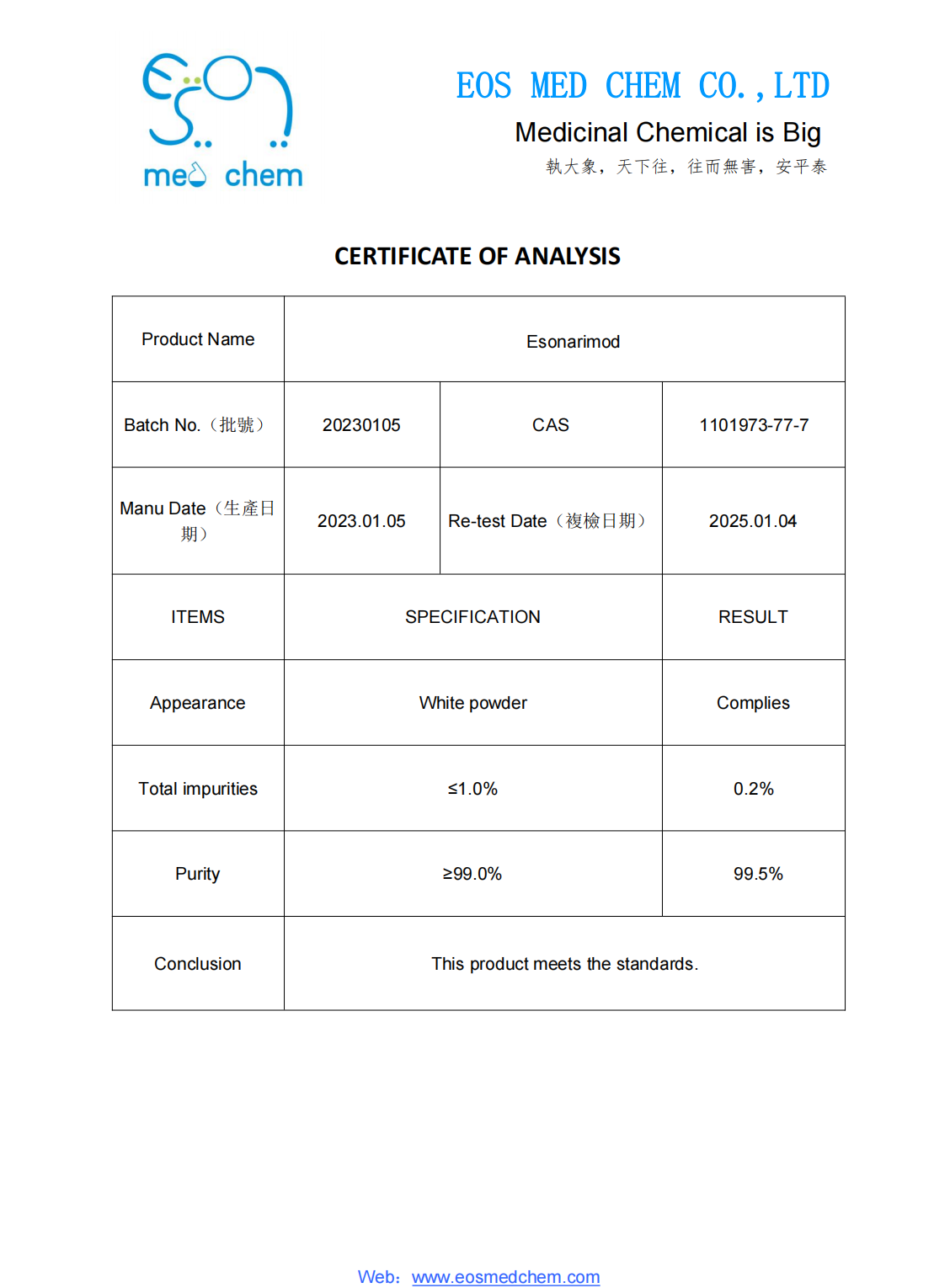 Esonarimod, CAS 1101973-77-7, Stock 390g, Assay 99.5%, White powder, Water 0.12%, Single Impurity 0.5%.