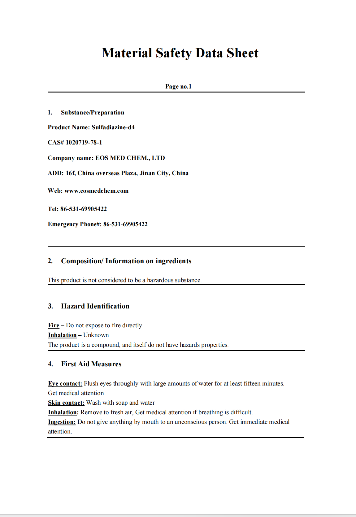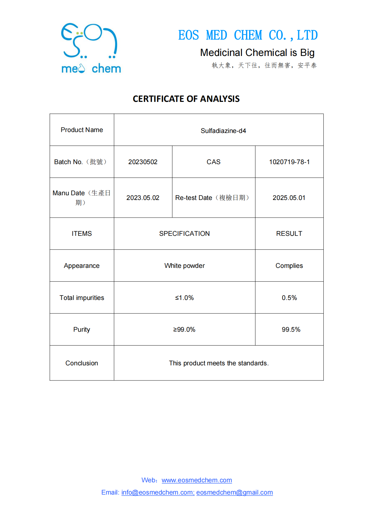 Sulfadiazine-d4, CAS 1020719-78-1, Stock 500g, Assay 99.5%, White powder, Water 0.39%, Single Impurity 0.5%.