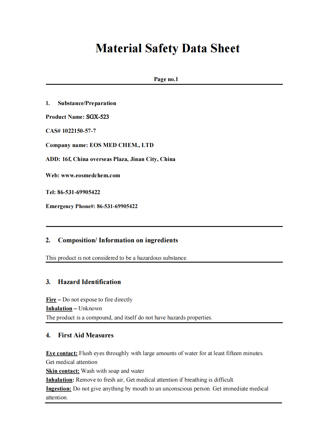 SGX-523, CAS 1022150-57-7, Stock 500g, Assay 99.7%, White powder, Water 0.14%, Single Impurity 0.3%.