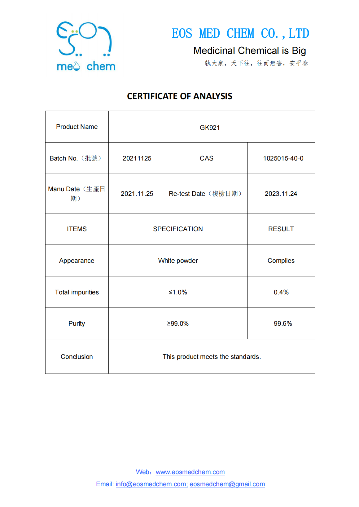 GK921, CAS 1025015-40-0, Stock 299g, Assay 99.6%, White powder, Water 0.41%, Single Impurity 0.4%.