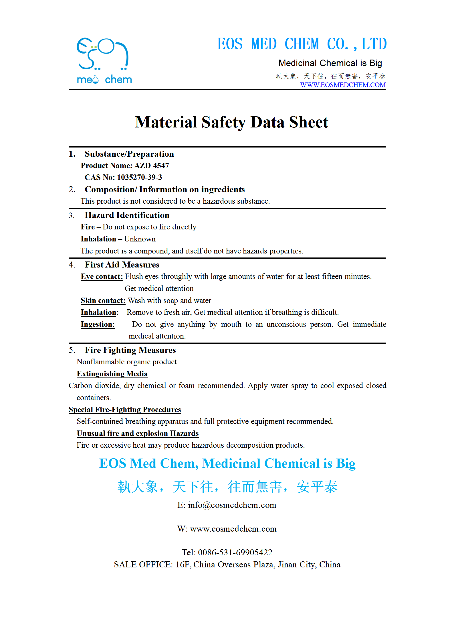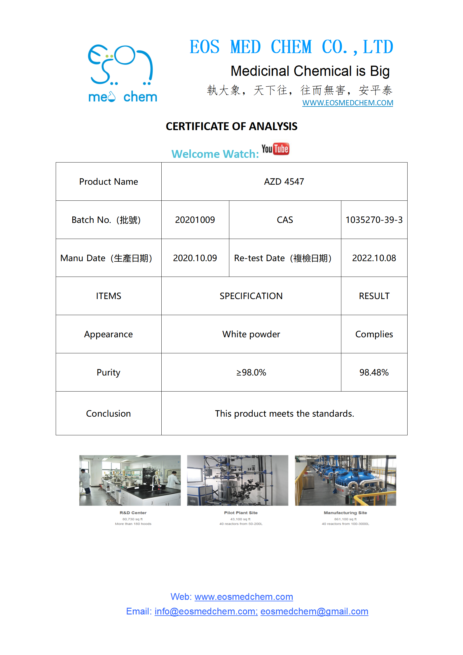 AZD 4547, CAS 1035270-39-3, Stock 673g, Assay 98.64%, White powder, Water 0.47%, Single Impurity 0.28%.
