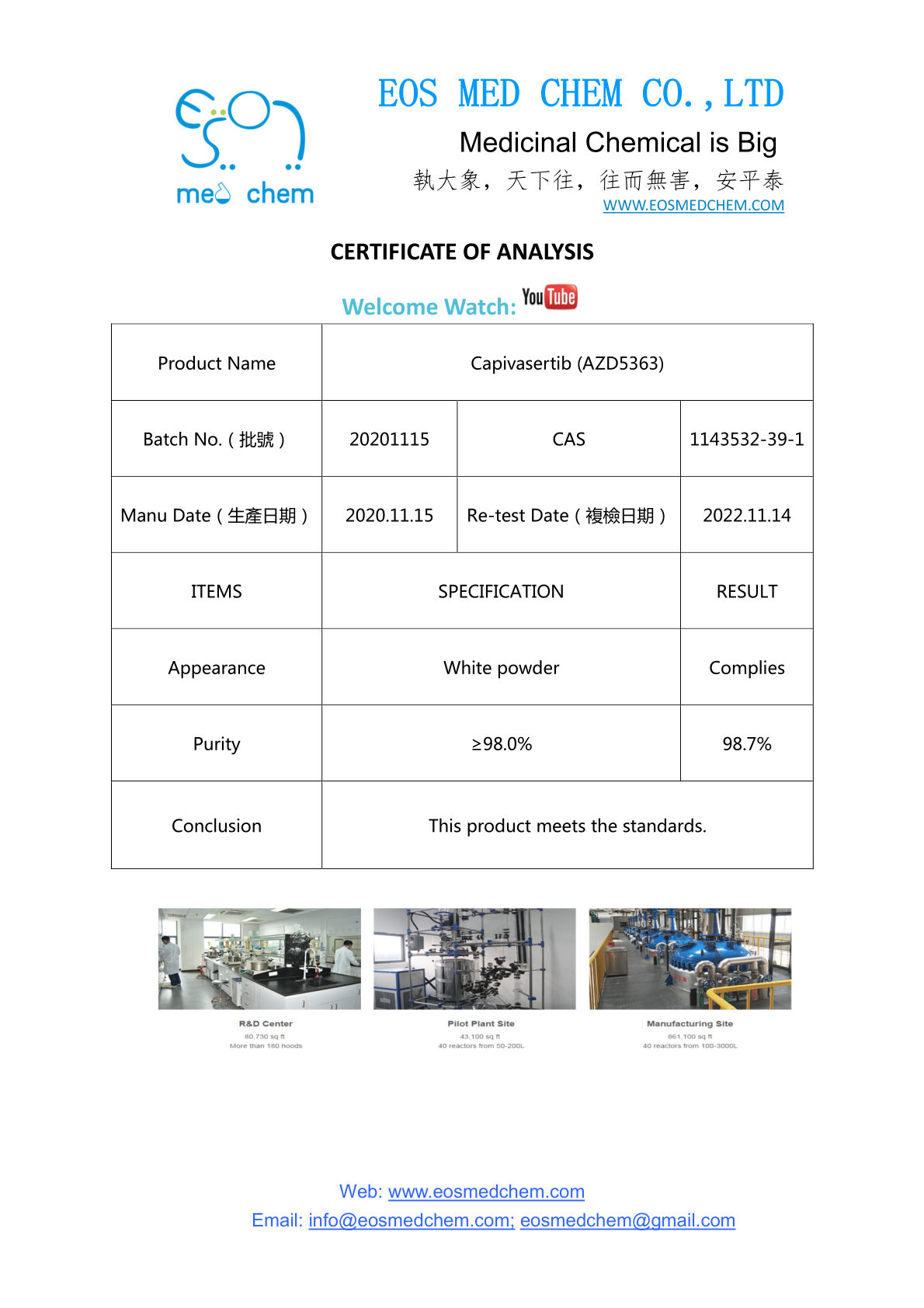 Capivasertib (AZD5363), CAS 1143532-39-1, Stock 483g, Assay 99.7%, White powder, Water 0.24%, Single Impurity 0.32%.