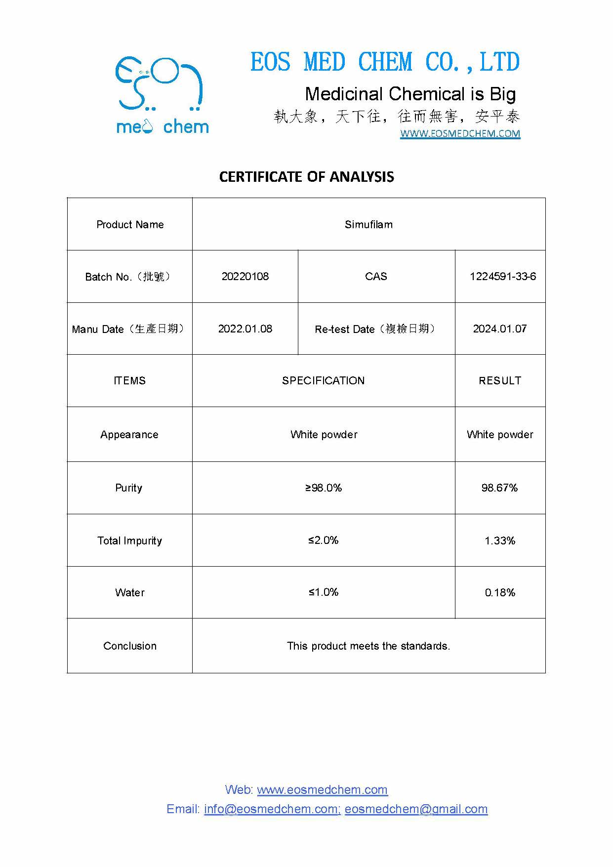 Simufilam, CAS 1224591-33-6, Stock 429g, Assay 99.5%, White powder, Water 0.54%, Single Impurity 0.5%.