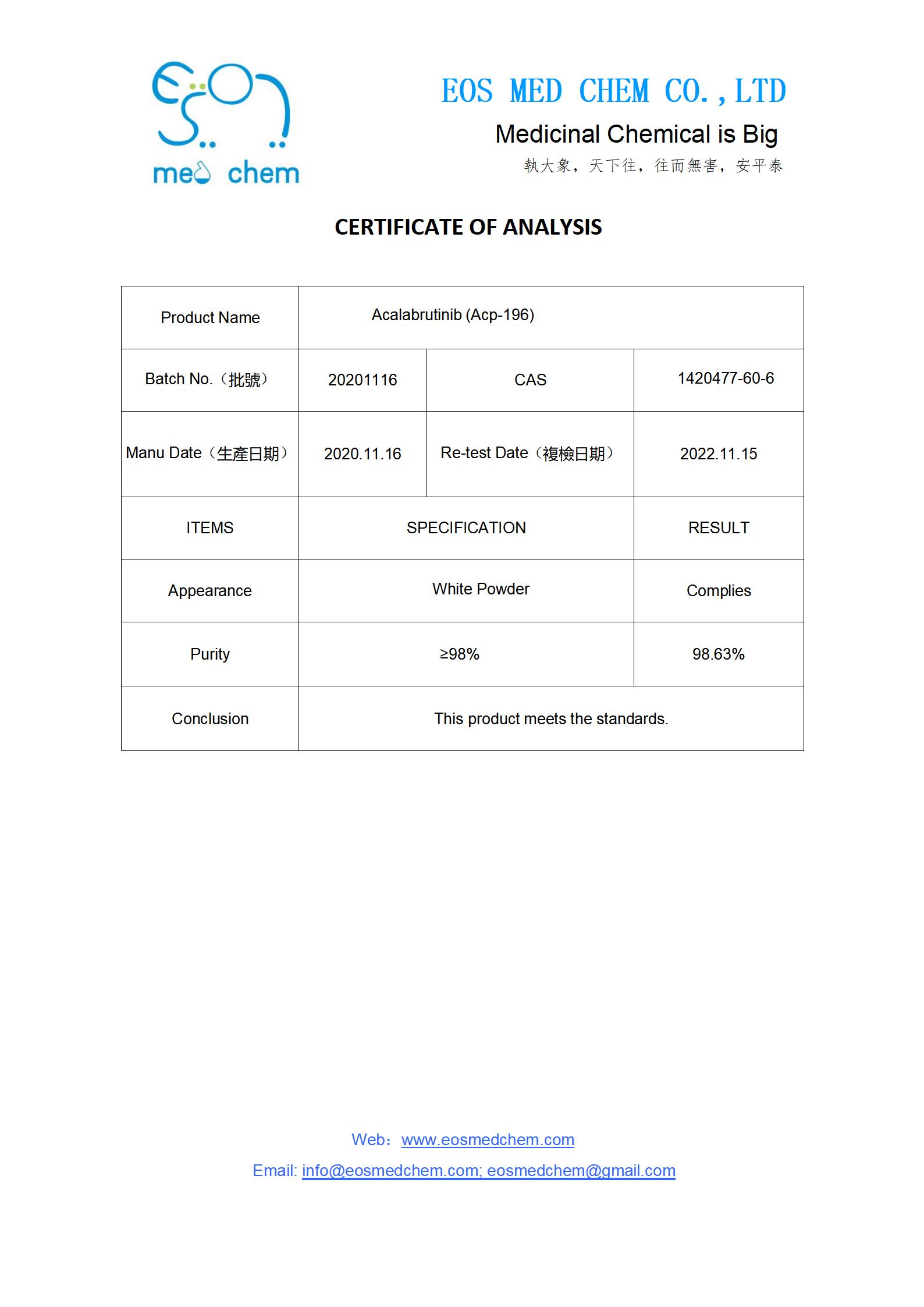 Acalabrutinib (Acp-196), CAS1420477-60-6, Stock 749g, Assay 98.52%, White powder, Water 0.34%, Single Impurity 0.32%.