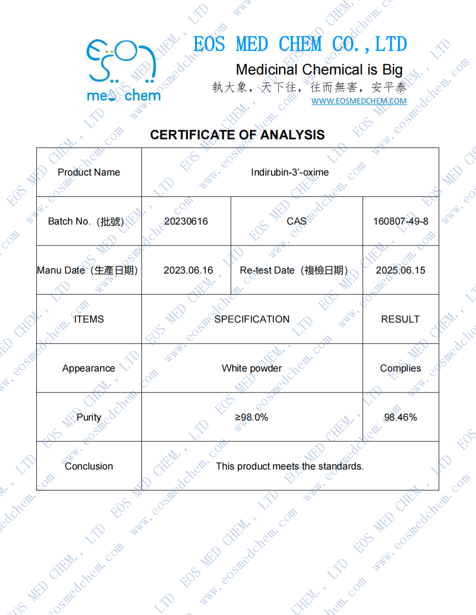 Indirubin-3’-oxime, CAS 160807-49-8, Stock 123g, Assay 98.46%, White powder, Water 0.22%, Single Impurity 0.14%.