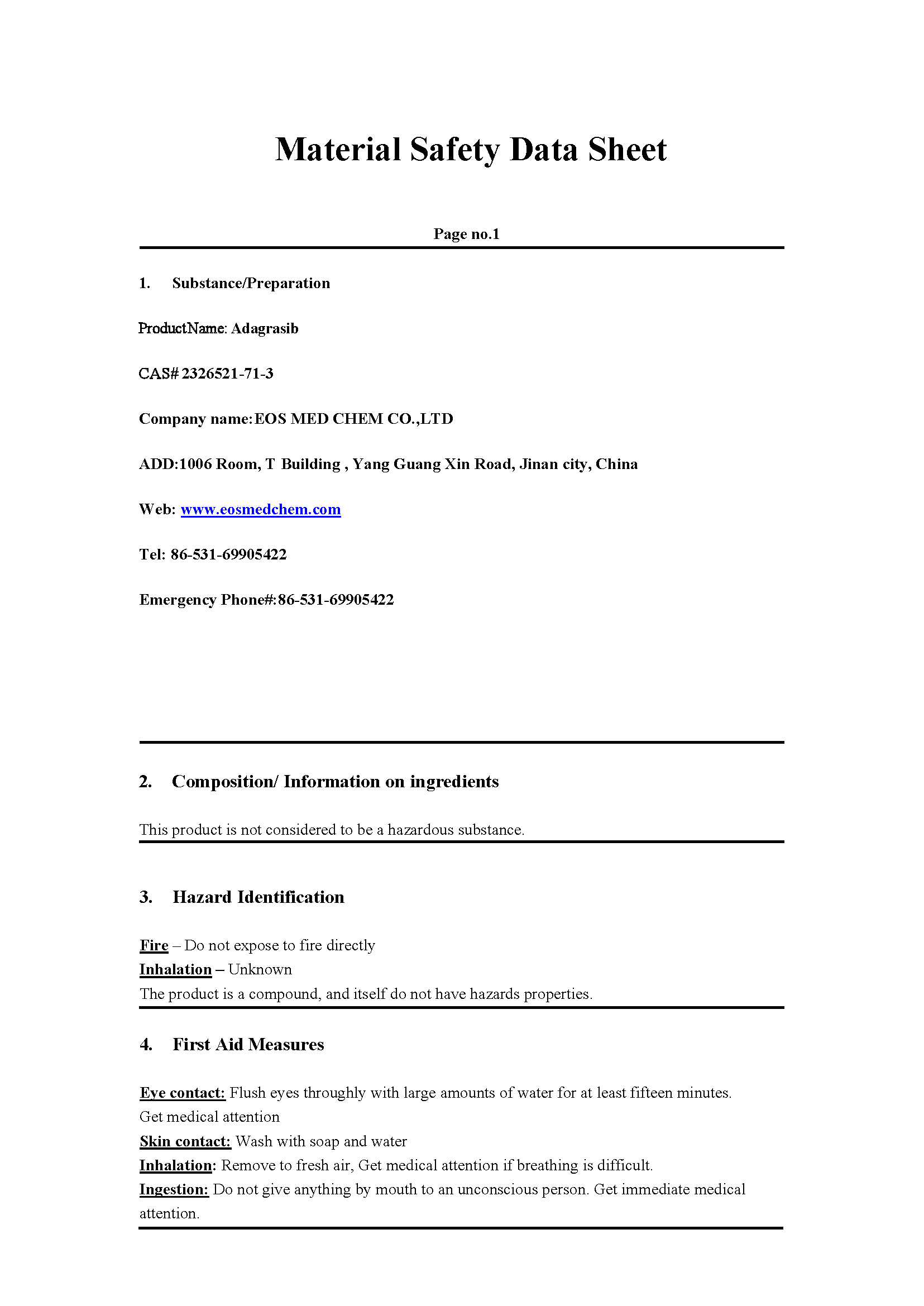 Adagrasib, CAS 2326521-71-3, Stock 640g, Assay 98.35%, White powder, Water 0.34%, Single Impurity 0.32%.