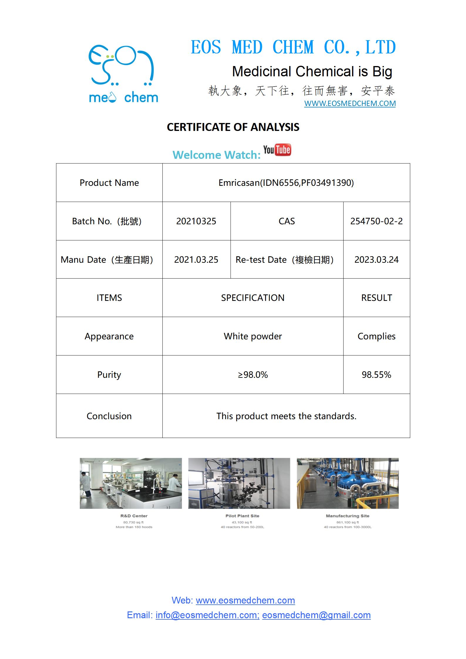 Emricasan(IDN6556,PF03491390), CAS 254750-02-2 Stock 786g, Assay 98.56%, White powder, Water 0.34%, Single Impurity 0.35%.