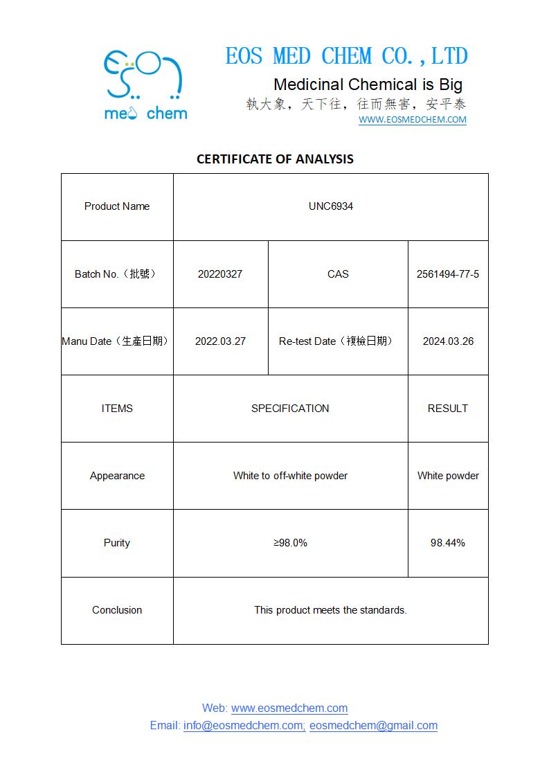 UNC6934 2561494-77-5, EOS is original supplier to Medkoo, Sigma, Trc and so on. UNC6934 2561494-77-5 package 1mg~100g is ok.