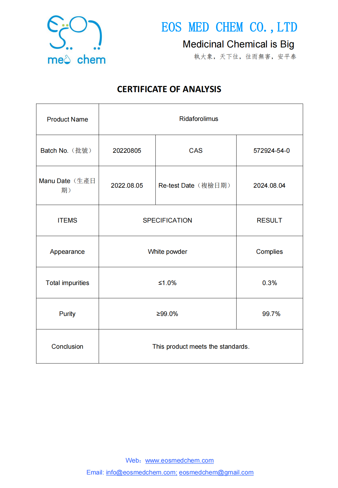 Ridaforolimus CAS 572924-54-0, Stock 479g, Assay 99.7%, White powder, Water 0.11%, Single Impurity 0.3%.