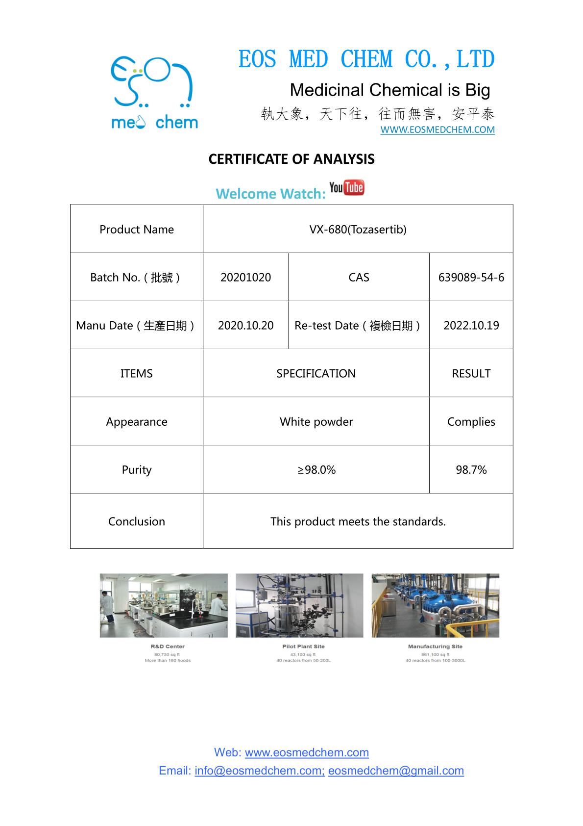 VX-680(Tozasertib), CAS 639089-54-6, Stock 811g, Assay 98.68%, White powder, Water 0.24%, Single Impurity 0.32%.