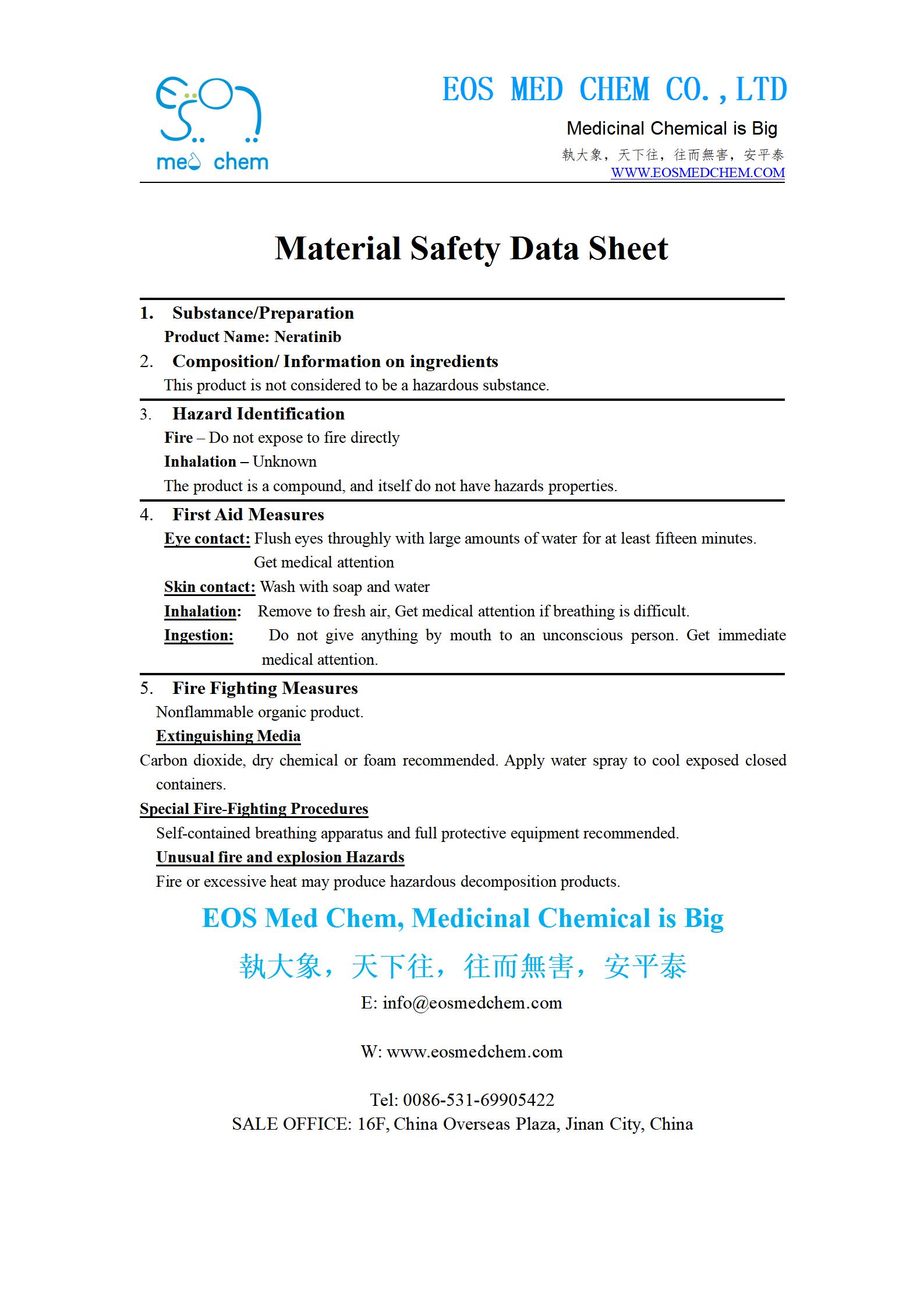 Neratinib, CAS 698387-09-6, Stock 739g, Assay 98.78%, White powder, Water 0.34%, Single Impurity 0.42%.