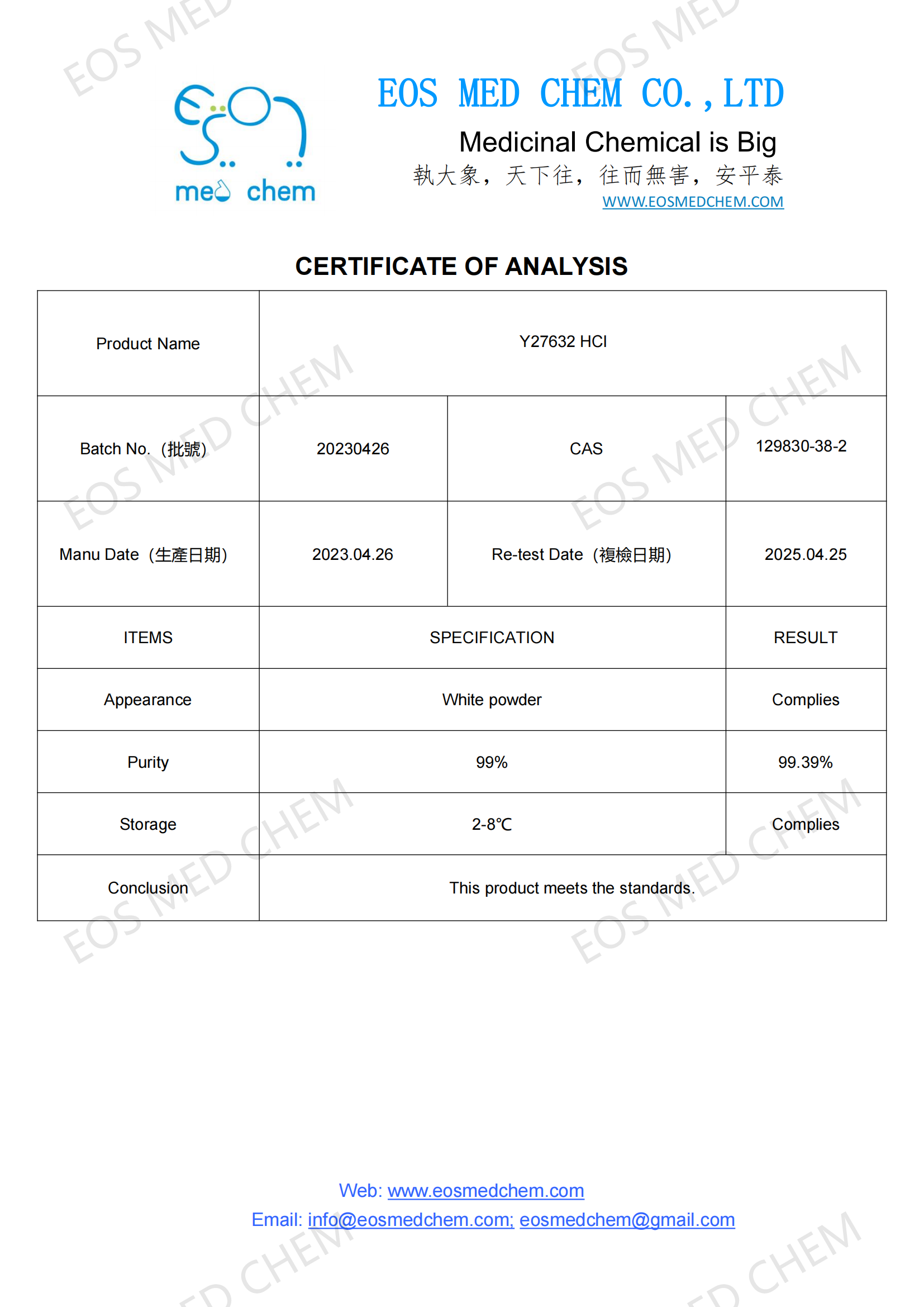 Y27632 HCl,CAS 129830-38-2, 原液 268g, 含量 99.39%, 白色粉末, 水 0.21%, 单一杂质 0.40%。