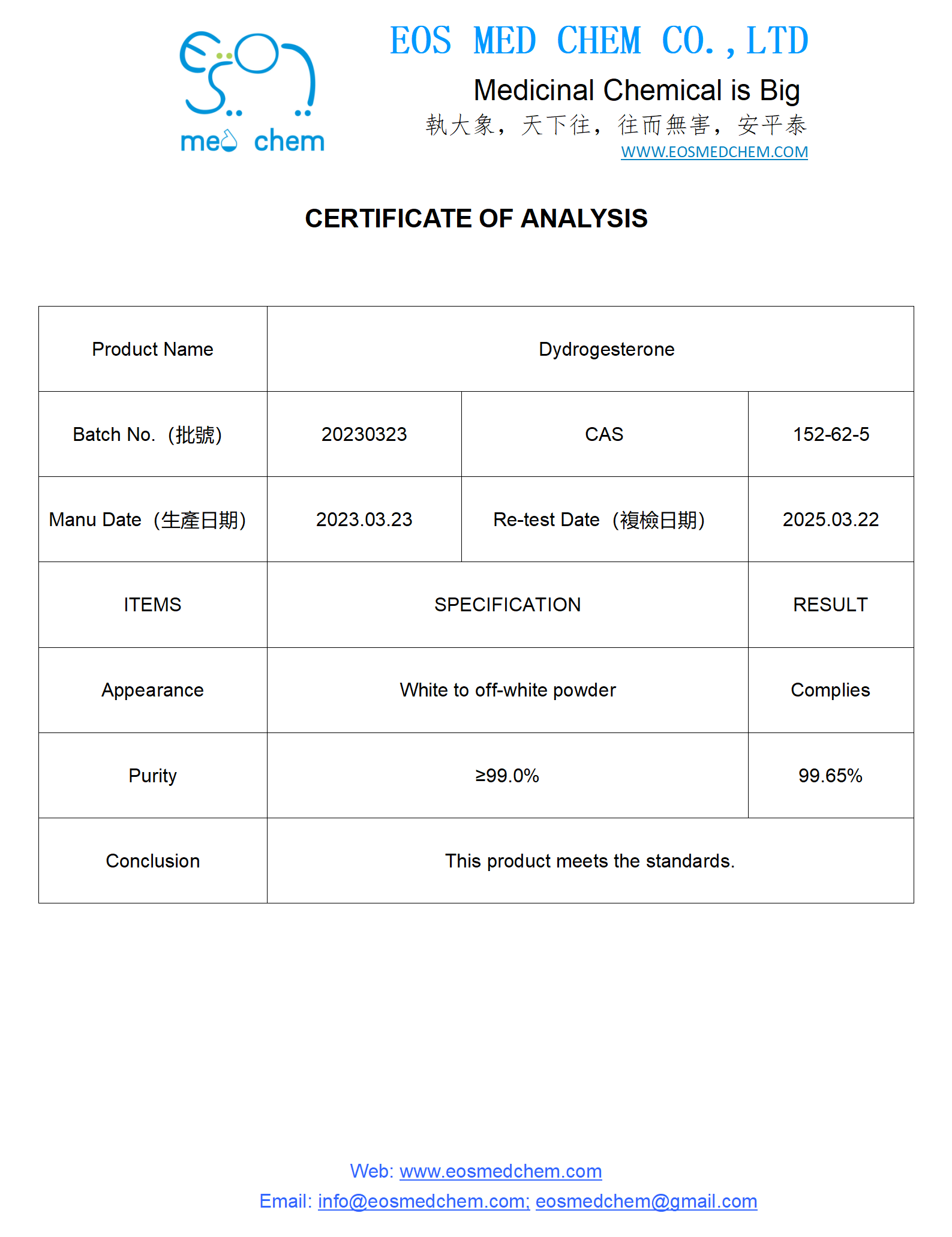 Dydrogesterone, CAS 152-62-5, Stock 483g, Assay 99.65%, Off-White powder, EOS Med Chem is big manufacturer of Dydrogesterone.