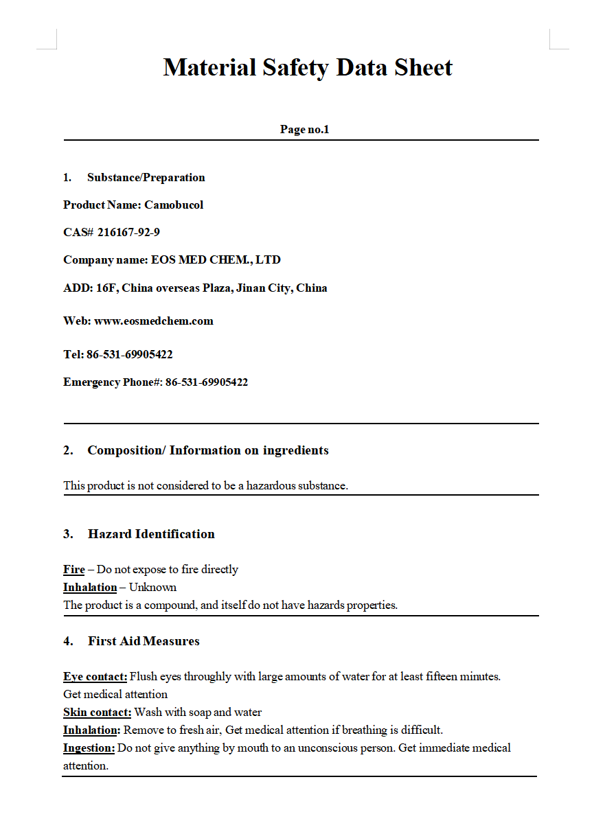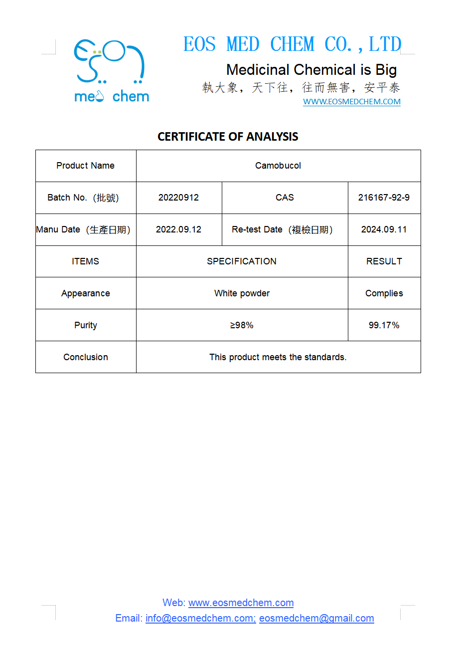 Camobucol, CAS 216167-92-9, Stock 27g, Assay 99.17%, White powder.