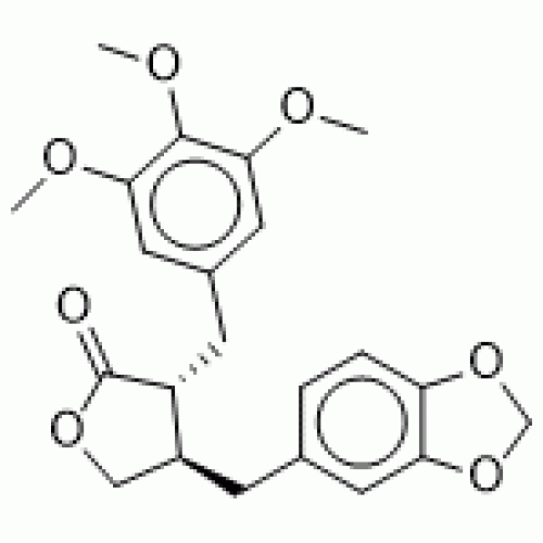IUPAC/Chemical Name: 2(3H)-Furanone, 4-(1,3-benzodioxol-5-ylmethyl)dihydro-3-((3,4,5-trimethoxyphenyl)methyl)-, trans-(-)-