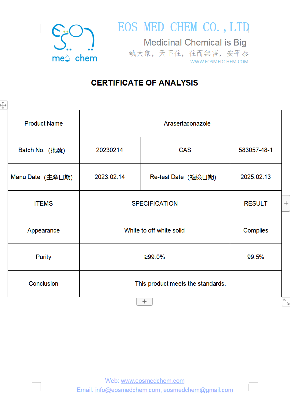 CAS 583057-48-1: Arasertaconazole, Stock 410g, Assay 99.5%, Off-White powder, EOS Med Chem is big manufacturer of Arasertaconazole.