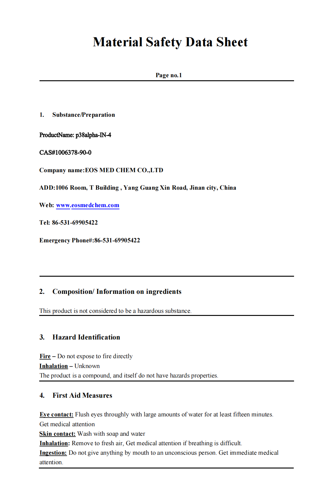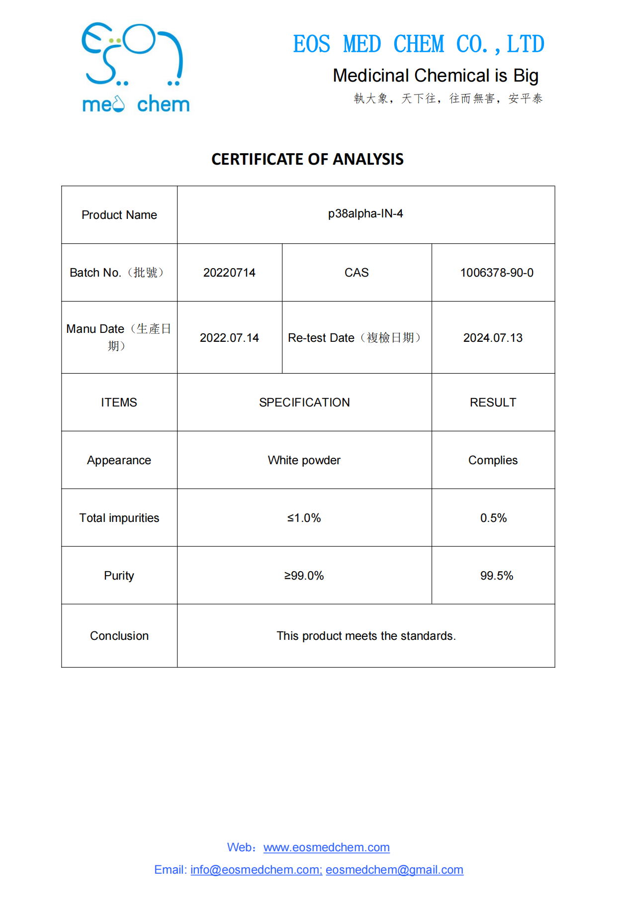p38alpha-IN-4, CAS 1006378-90-0, Stock 473g, Assay 99.5%, White powder, Water 0.41%, Single Impurity 0.5%.