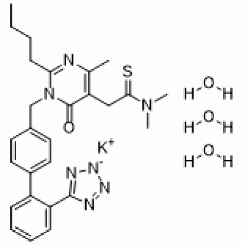 IUPAC/Chemical Name: 5-Pyrimidineethanethioamide, 2-butyl-1,6-dihydro-N,N,4-trimethyl-6-oxo-1-((2'-(2H-tetrazol-5-yl)(1,1'-biphenyl)-4-yl)methyl)-, potassium salt, hydrate (1:1:3)