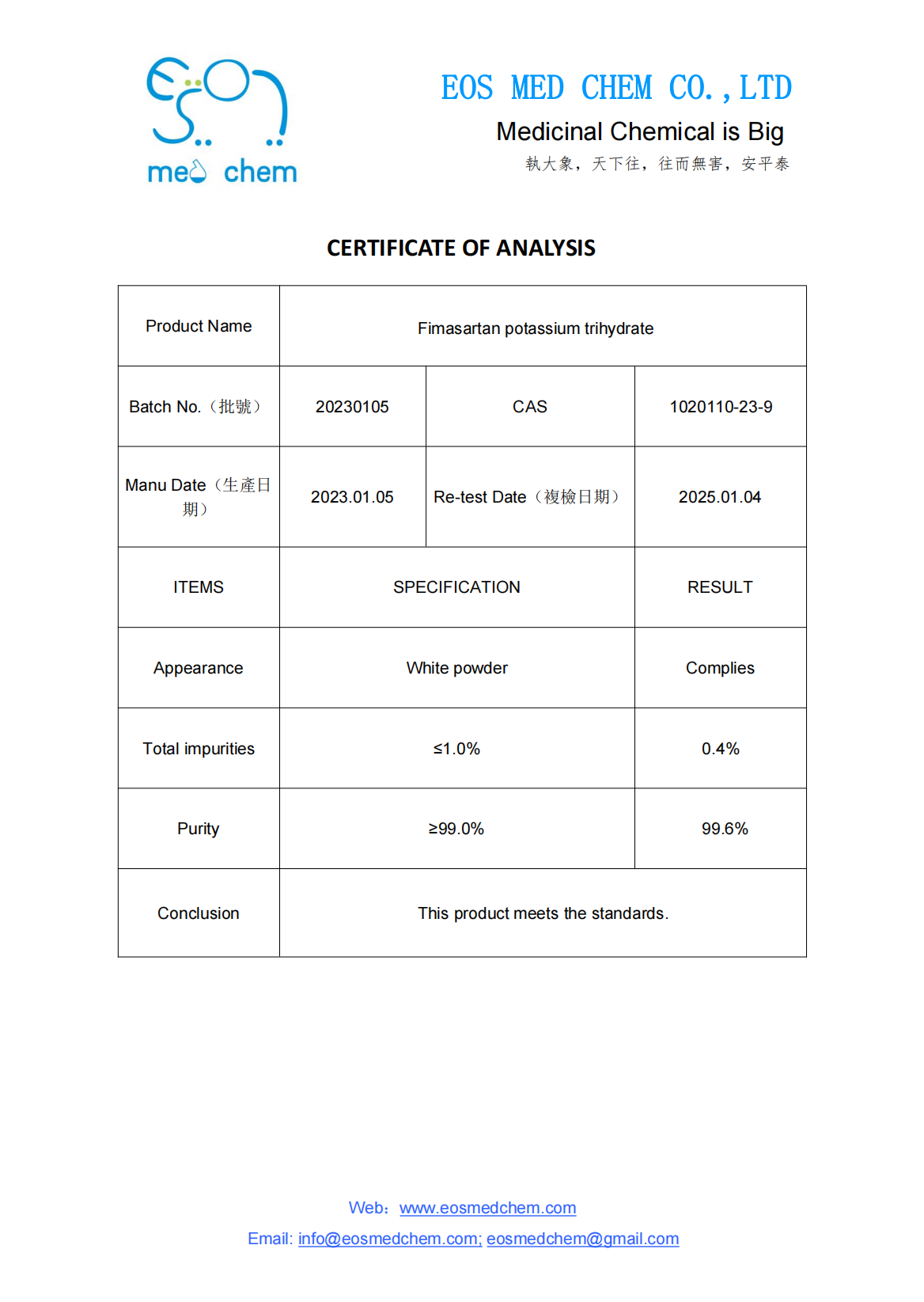 Fimasartan potassium trihydrate, CAS 1020110-23-9, Stock 410g, Assay 99.6%, White powder, Water 0.12%, Single Impurity 0.4%.